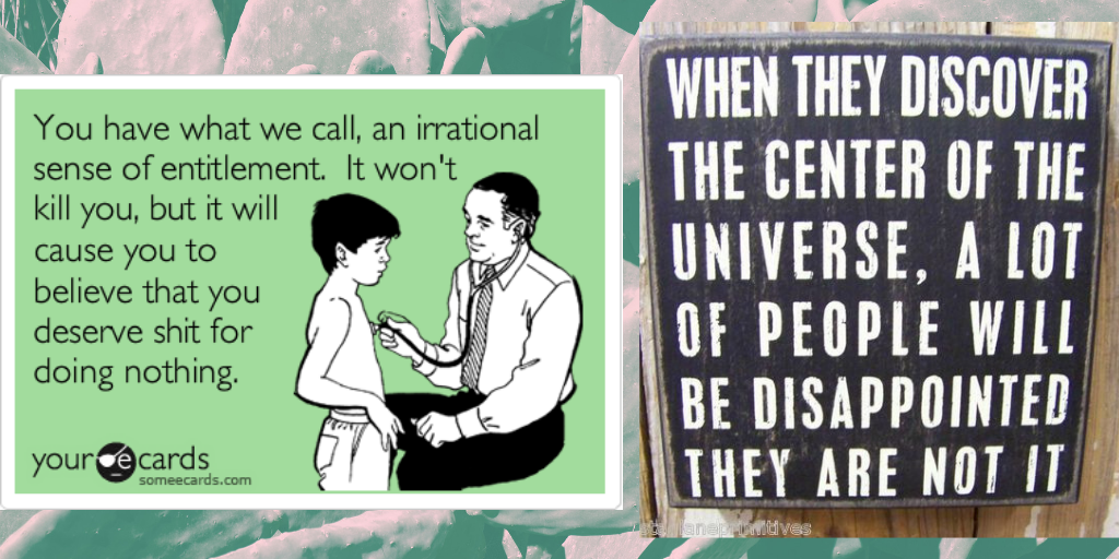Our EGOS, when ignited out of proportion, can make people feel superior and more ENTITLED than others, a false illusionment and one that can cause an incredible amount of harm to the egotistic and those in their path. EGO can become narcissistic which = Entitlement but is derived by a deep sense of insecurity within the entitled person.