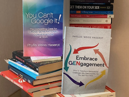 Phyllis Weiss Haserot (Haz-er-o), a “uniter” dubbed the “cross-generational voice.” Is in the business of uniting people, purpose, potential; and profit across the generations. She works with organization leadership and multi-generational teams focused on both external and internal stakeholder relationships to solve the increasingly urgent problems inherent in retaining the most desirable talent and clients. She leads Cross-Generational Conversation workshops, forums, and masterminds for professionals, knowledge workers, and university student and alumni communities. Phyllis is co-host of the Legacy-Makers@Work podcast. She is the author of You Can’t Google It! The Compelling Case for Cross-Generational Conversation at Work and “Embrace GENgagement” President and Founder of Practice Development Counsel, business development and organizational effectiveness consultancy, Phyllis is a speaker, podcaster, columnist, and blogger on intergenerational relations and multi-generational workplace issues for Thomson Reuters Institute, Forbes.com, Next Avenue, Legal Executive Institute, LinkedIn, among others.